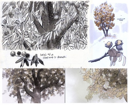 Variations for the Nut Tree, seen by the Mouse at the very beginning of the film and later serving as the dramatic location for the Mouse's first encounter with the Gruffalo. Drawings by Manu Arenas.