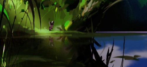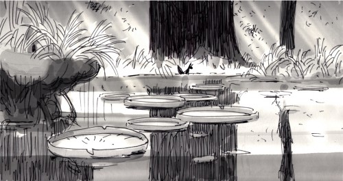 Below: An early sketch Manu Arenas had originally done for the film's framestory (see Mother Squirrel in the background) ended up serving as the layout for Mouse's lilypad-passage over the lake. See the German version of "The Gruffalo" premiere on Dec 24th 10.40 am on ZDF.