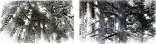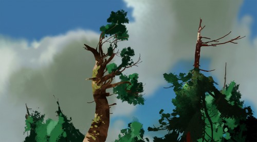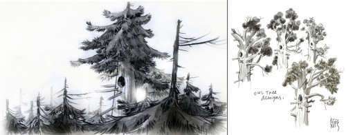 Top: Owl's windbeaten "treetop house", in a colourkey by Neil Ross. Below: An earlier layout for that same shot, with Owl's house still seated in a conifer and some later designs for the tree as a broadleaf, both by Manu Arenas. Bottom: Manu's eerie designs for the spiral staircase Mouse escapes on in that sequence.