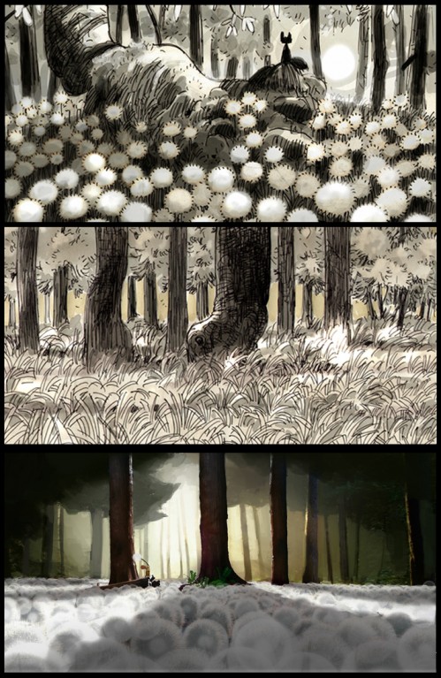 Manu Arenas' wonderful, early b/w concepts (top and middle) inspired the "field of dandylions" sequence, which was later further visualized by the very talented Louis Tardivier (bottom).