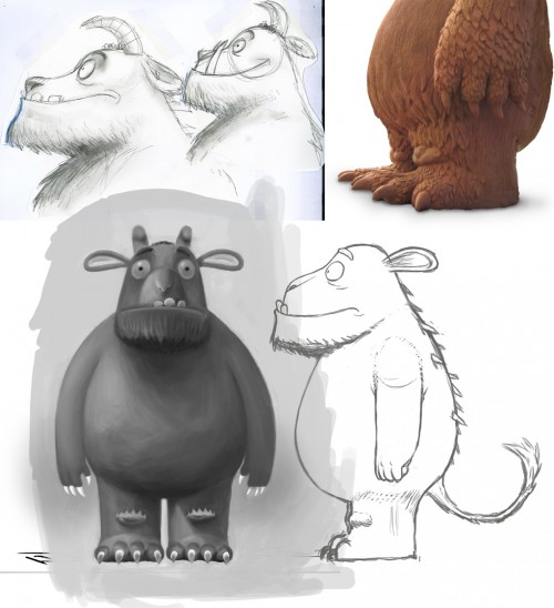 Above: Max Lang's initial turnaround, which first gave the Gruffalo (drawn exclusively from a side view in the childrens' book) a threedimensional treatment. Below: Early preliminary sketches and a modelsheet based on Max's turn-around, both by Jakob Schuh. Maquette by Klaus Morschheuser. See "The Gruffalo" on Dec. 24th, 10.40 am on ZDF.