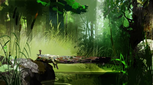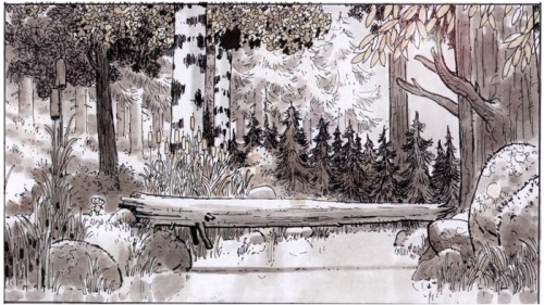 Top three: Variations of the "bridge" on which Mouse first meets Owl, artwork by production designer Manu Arenas. Bottom: Colourkey of Manu's final design by the great Neil Ross. More from that sequence here.